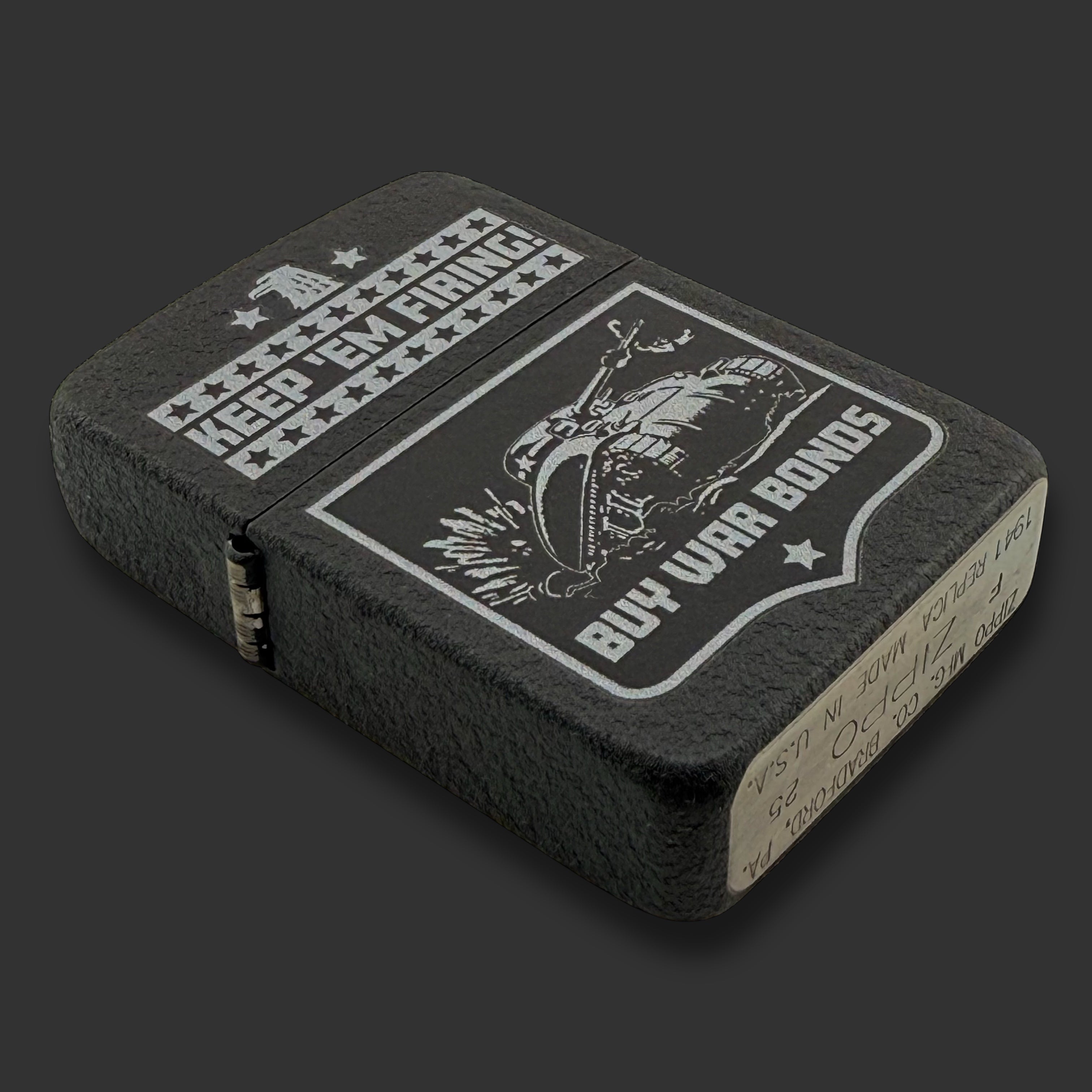 This Zippo lighter design by Chuck Riley was inspired by World War 2 posters that encouraged every U.S. citizen to do their part for the war effort. The Color Image design is perfectly at home on the Black Crackle® 1941 Replica Zippo lighter. This is the first in a series of designs that honor the memory of America's Greatest Generation. The Zippo gift box, Exclusive outer sleeve, and a Riley’s 66 Certificate of Authenticity are included.